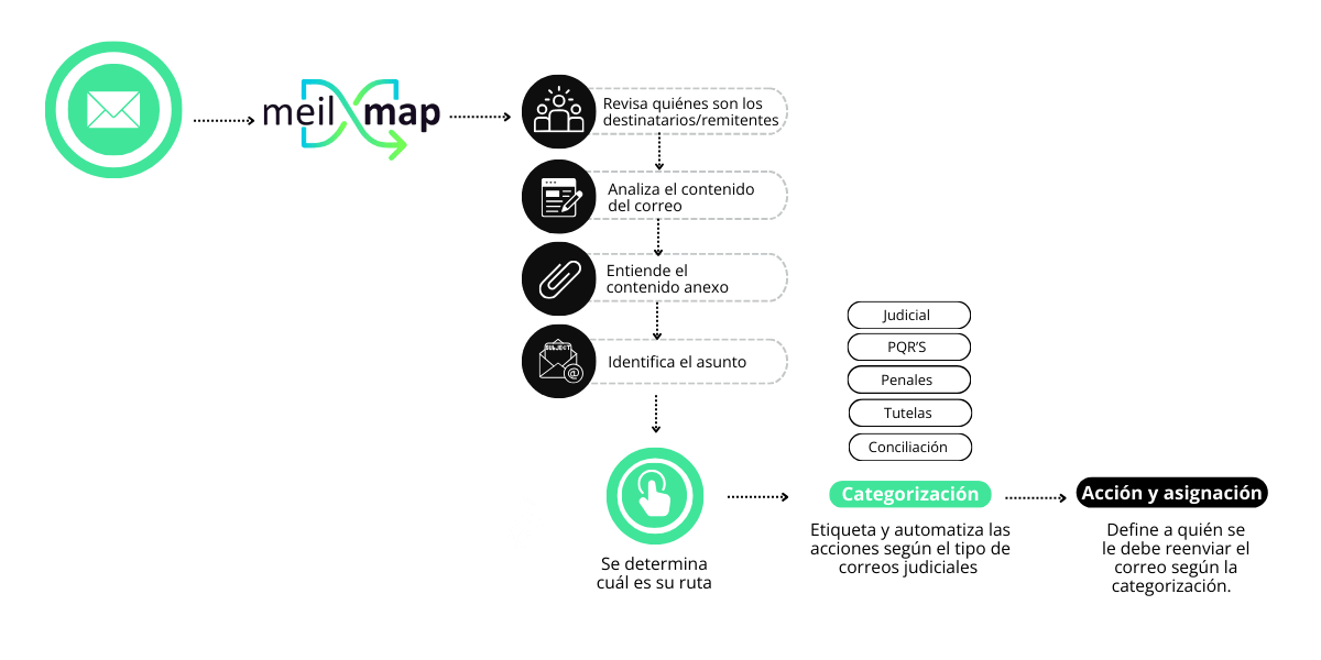 Consiste en utilizar tecnología que se encarguen de realizar las tareas repetitivas de su buzón judicial como leer, analizar, clasificar y enrutar los emails hacia las personas que deben gestionar las respuestas.